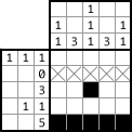 The lowest row, it says “5”. There are only five cells in the row, so, let’s paint them all! Then the next upper row, it says “1” and “1”. Well, can’t be figure out …let’s see one more upper row. The middle row, it says “3” only. But there are only five cells in each rows so that one cell must be painted no matter you would start painting from the left or from the right. |