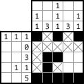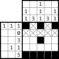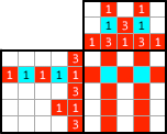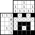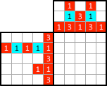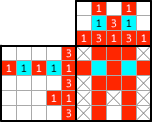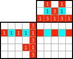 Paint the two left cells. Although there are only two cells are left in this exercise, you can figure out by on other way. The painted cells should be next to each other so that the three cells should be continuously painted from the lowest cell, which has been painted already. And then, how about the middle column? Three “1”s. Oh! It’s done! |